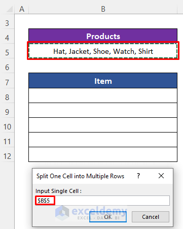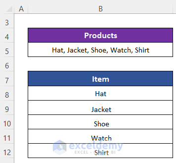 We have placed five product names (separated by commas and spaces) in Cell B5. We’ll split them into multiple rows along cells B8:B12.