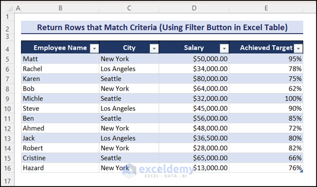 The following dataset represents the employee details of a company. Here, the column Achieved Target shows the performance of the employees. We want to return the rows based on the value of the Achieved Target column.