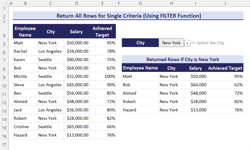 Note: We have used the Data Validation tool in cell H5. You can choose a specific city from here. If you choose New York, the FILTER function will return the rows where the city name is New York.